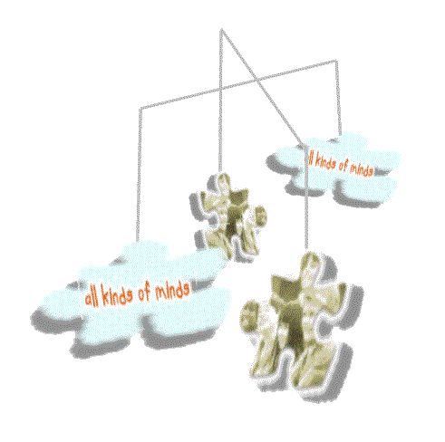 This sculpture is made of inflated pieces taken from the "all kinds of minds" logo. Each piece is like a thick air mattress, made of nylon and airbrushed with your logo. The baffles that keep the piece from inflating into a round pillow will follow the outlines of the children, so each child's face will be in relief. A florescent light is mounted inside so they will glow beautifully in the air. They are dynamic and can move with the breeze. In a stage setting they could be kept in motion with a small fan.